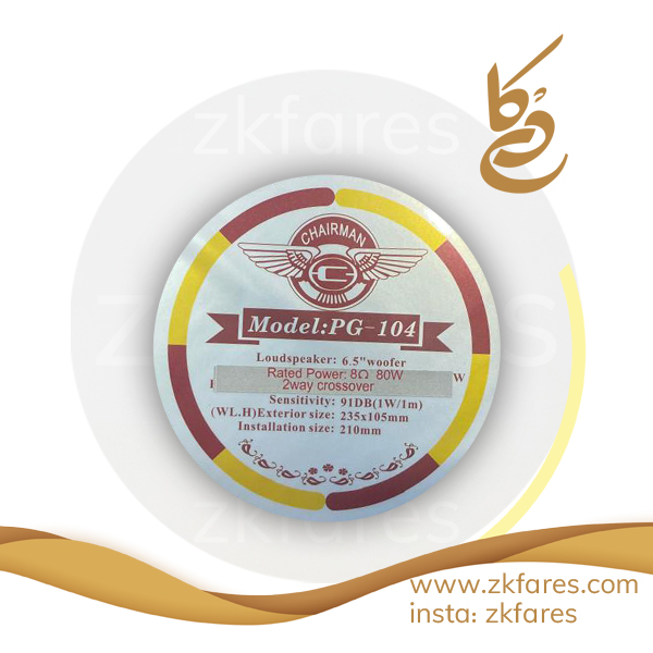 اسپیکر سقفی چیرمن CHAIRMAN PG-104 دارای سایز بلندگو 6/5 اینچ می باشد. باند توکار سقفی چیرمن مدل Chairman PG104، یک باند two-way بوده و با قدرت خروجی 80 وات واقعی صدای دلنشینی را تولید می کند. جنس اسپیکر هالوژنی چیرمن بسیار مرغوب بوده و بدنه آن از جنس ABS ساخته شده است.
